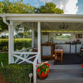 All of our guests are able to enjoy our beautiful country gardens, including the summer-house which has a BBQ, kitchenette facilities, bar seating, fridge, pizza oven and a gorgeous view! It's a magic spot to enjoy a meal by self-catering using all of the facilities available.